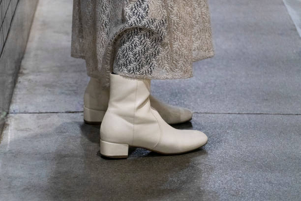 A low-angle shot of a woman wearing a light-colored lace dress and white ankle boots. The focus is on the woman’s legs and feet, showing the boots in detail. The background is a textured gray surface, possibly a sidewalk or floor. The image captures a stylish and feminine look, highlighting the dress’s and the boots’ texture.