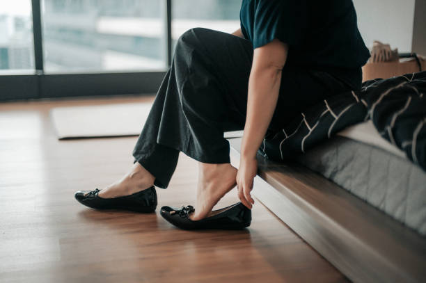 an asian chinese mid adult is getting ready wearing her shoes before leaving her apartment