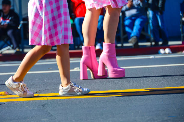 A woman in pink platform boots walks along a parade route in downtown Oxnard, California. Alongside her is a girl in flat athletic shoes.